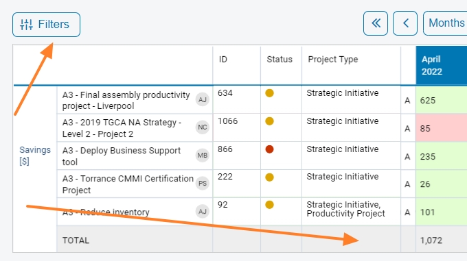 Filters automatically include all project sections used in your dashboard. Export for further analysis.